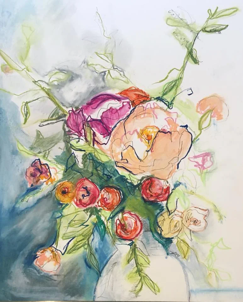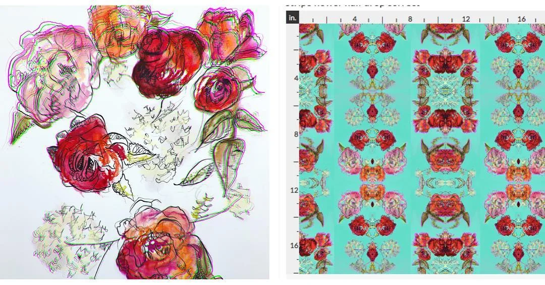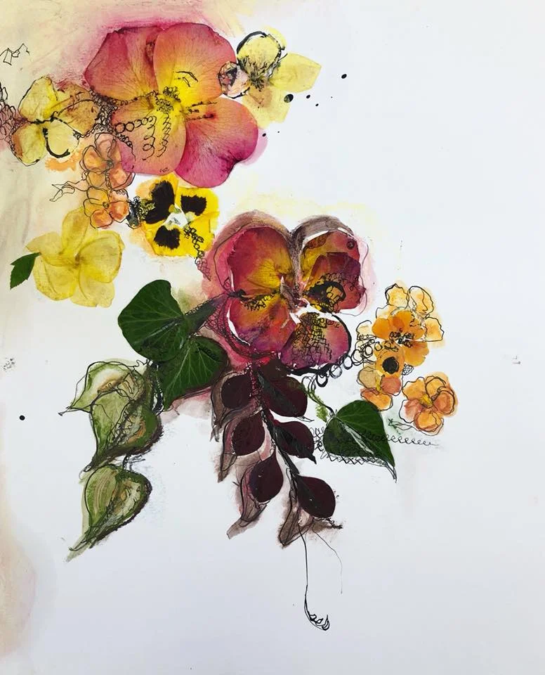 Ink, oil pastel & collage on paper and wallpaper designs (some contain pressed flowers)